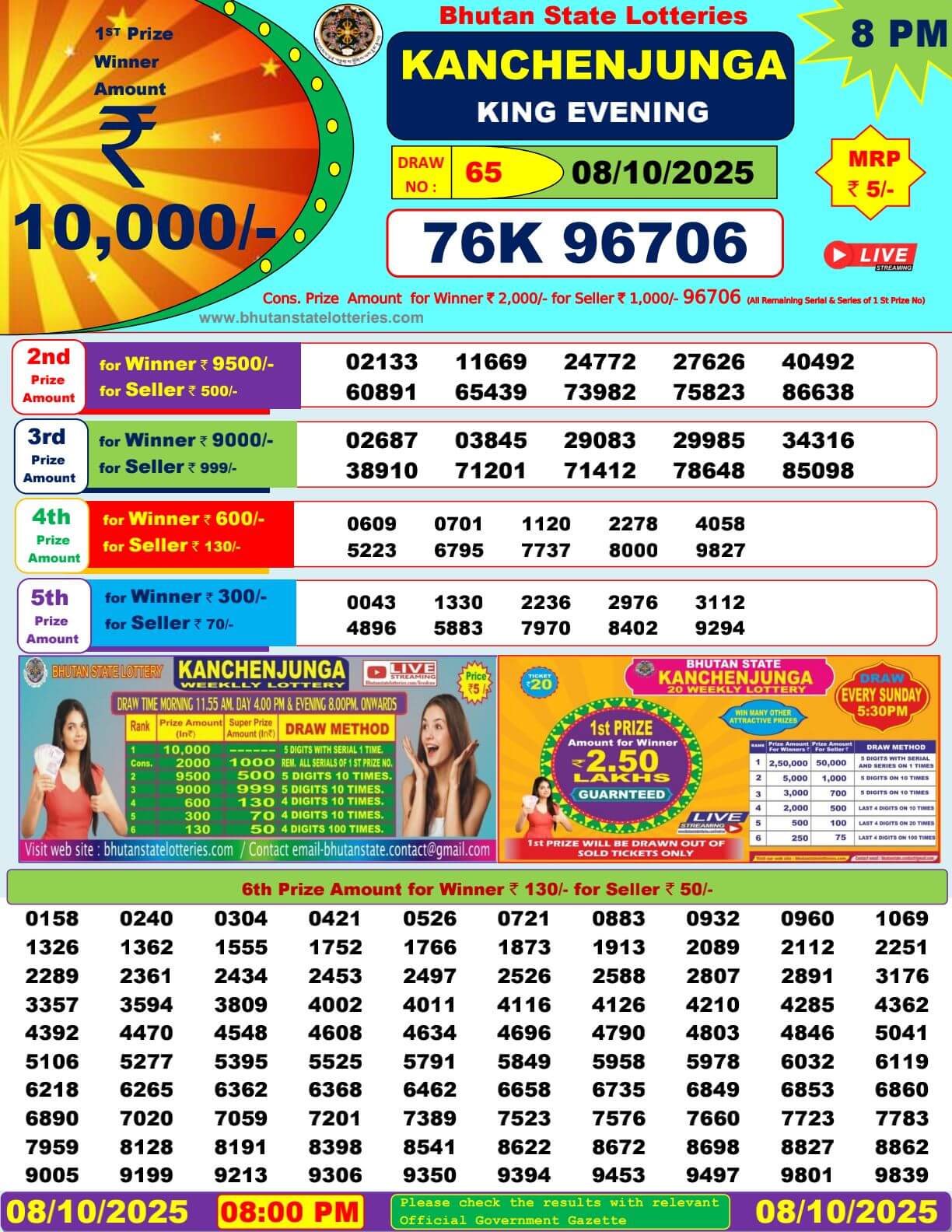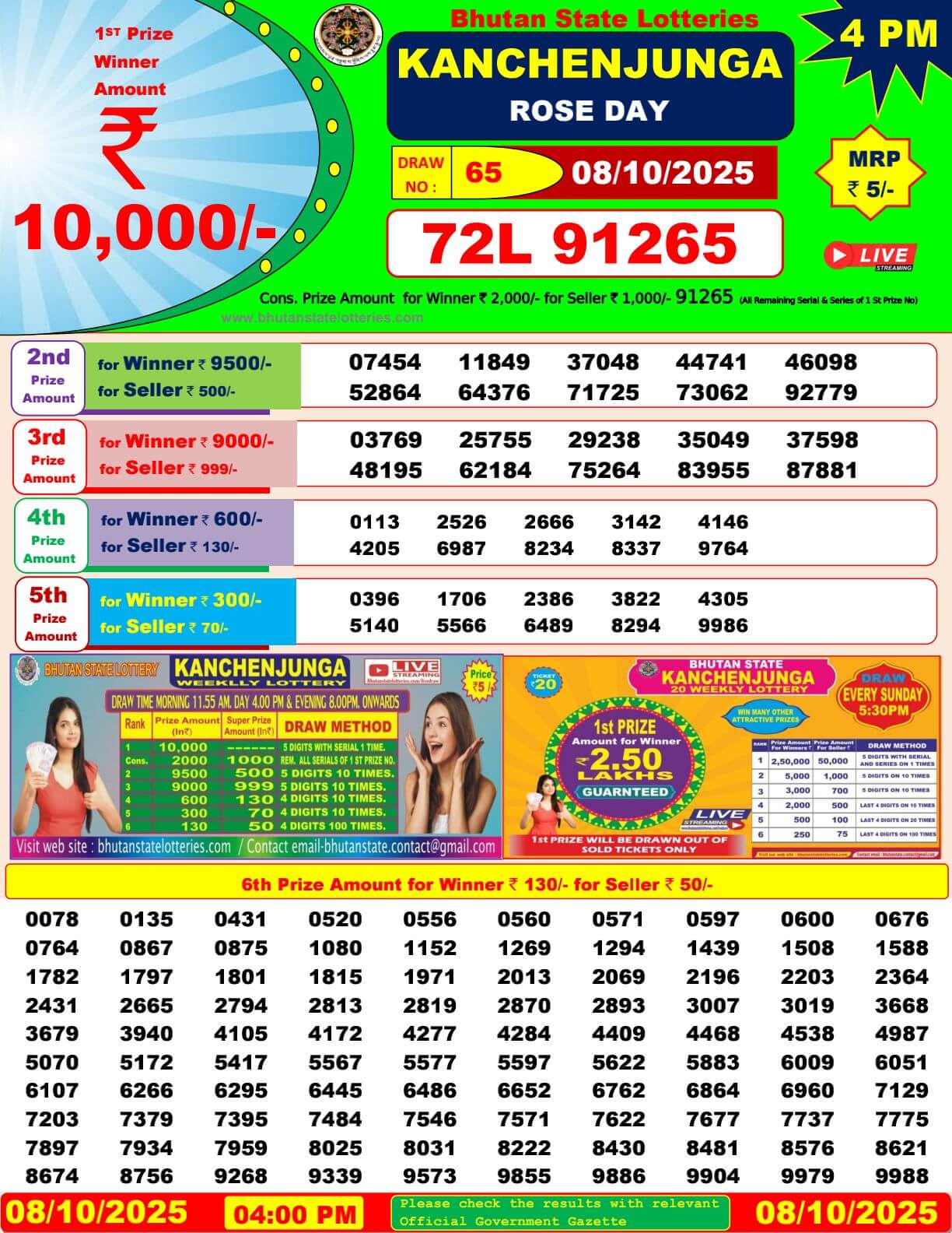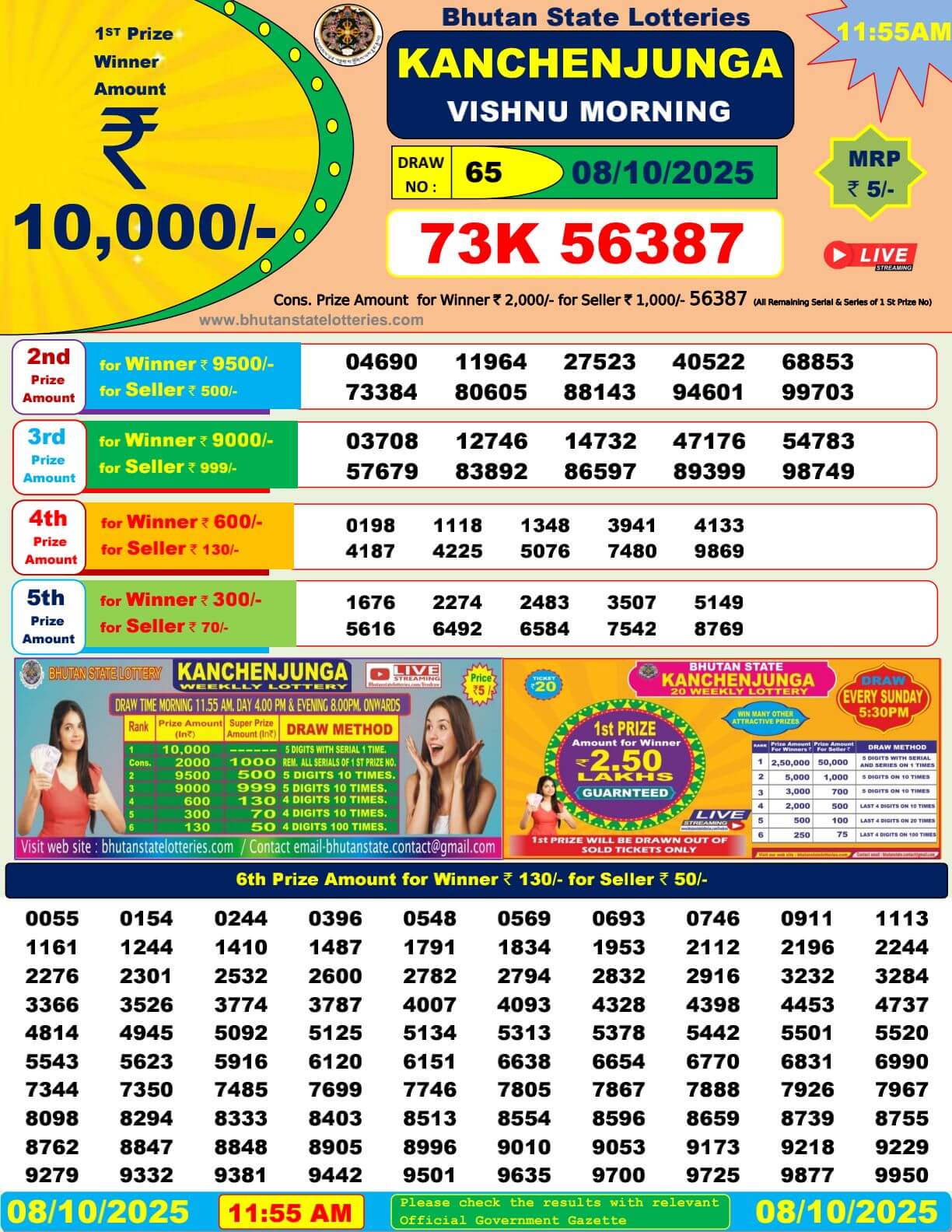 Bhutan State Lottery Result Today of Kanchenjunga Lottery – 11:55 AM Morning, 4:00 PM Day, and 8:00 PM Evening / Night Live on LotterySambad.one.