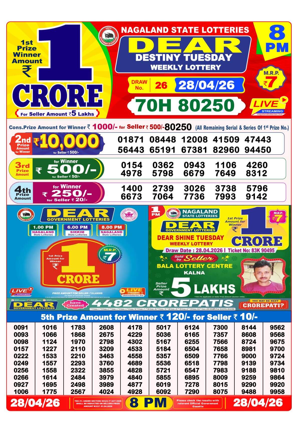 Dhankesari Today’s Result of Nagaland State Lottery – 1:00 PM Morning, 6:00 PM Day and 8:00 PM Evening / Night Live on Dhankesari Dear Lottery Sambad.