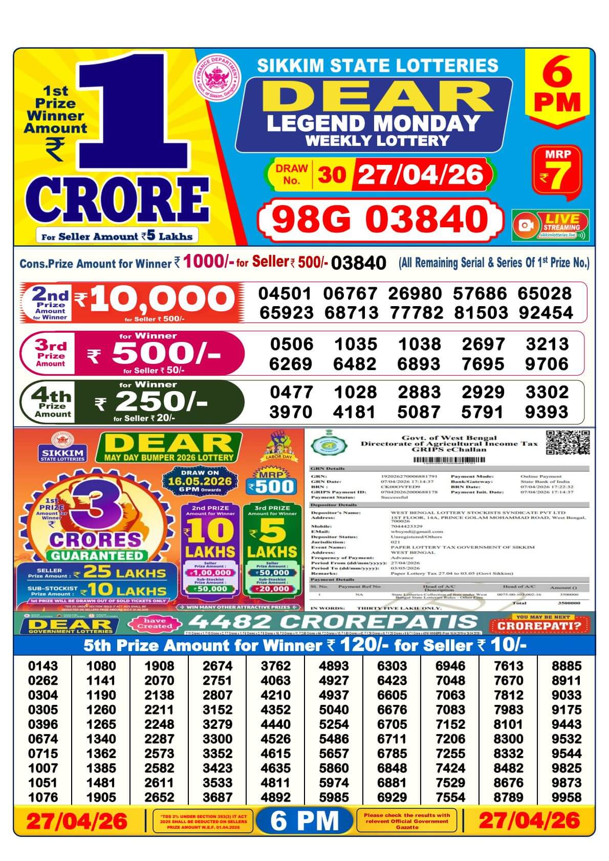 | Thursday | Dear Supreme Thursday Weekly Lottery |